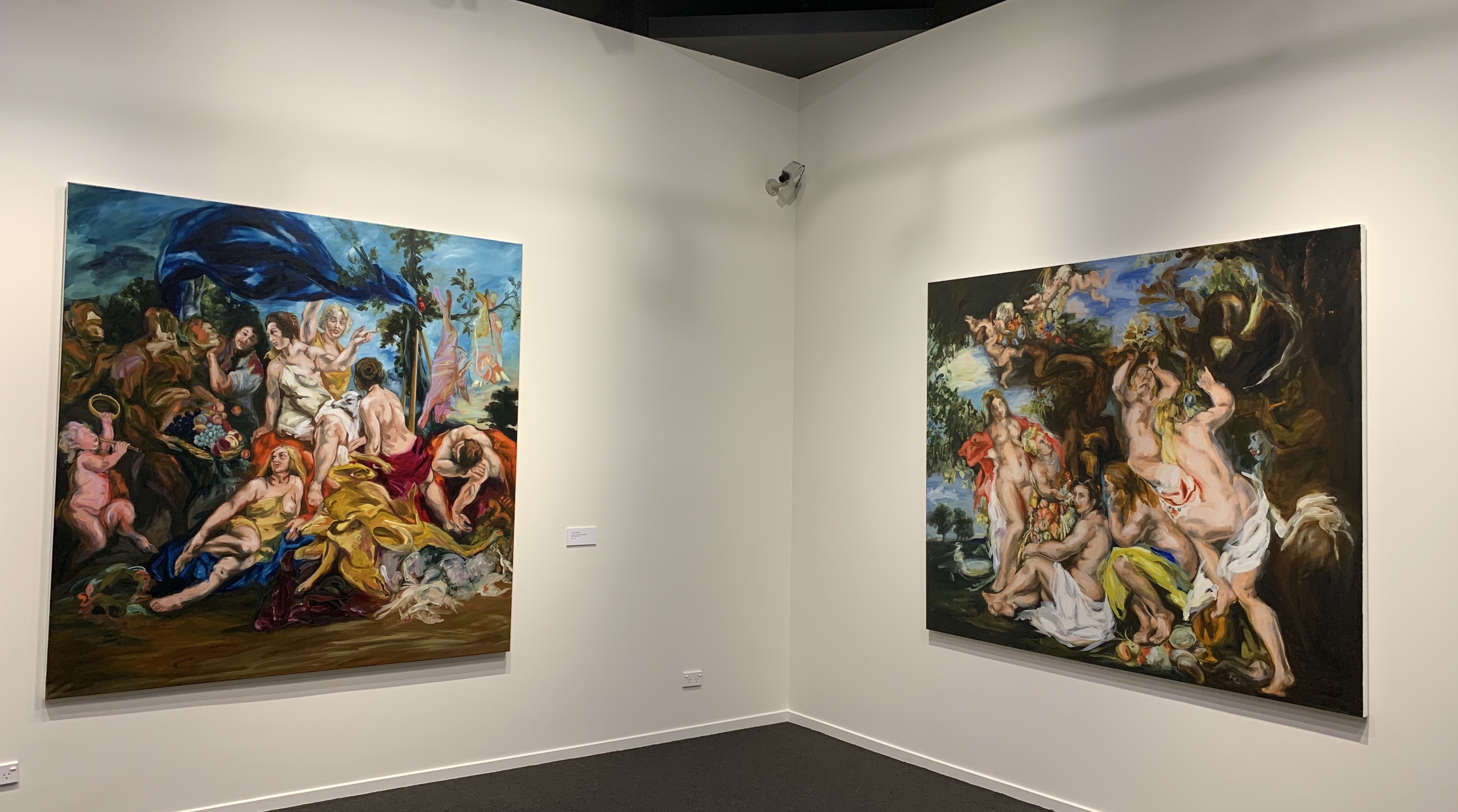In both history and narrative, women, and their knowledge have been murdered, silenced, forgotten, their stories minimised, even romanticised. Anita’s Potion seeks to aid in redressing this injustice and draw attention to patriarchal threats that still loom, that frighteningly in some spheres are presently gaining force. Reinterpreting historical art as a means of communicating a message allows emphasis on different elements. She brings the women to the fore while ghosting their male counterparts. You will note that some of the figures have colourful skin which signals inclusiveness of all oppressed peoples – non-white ethnicities, and trans and gender diverse. These paintings brim with symbolism and surrealist magic. The free and fluid brushwork flow in the abstract expressionism Anita had, of recent times been favouring. Yet she found herself moving towards a more representational style so her paintings could clearly express her voice. Potion prompts viewers to ask, ‘What is my story? What really is the story of those gone before us? Why does this matter now?’
