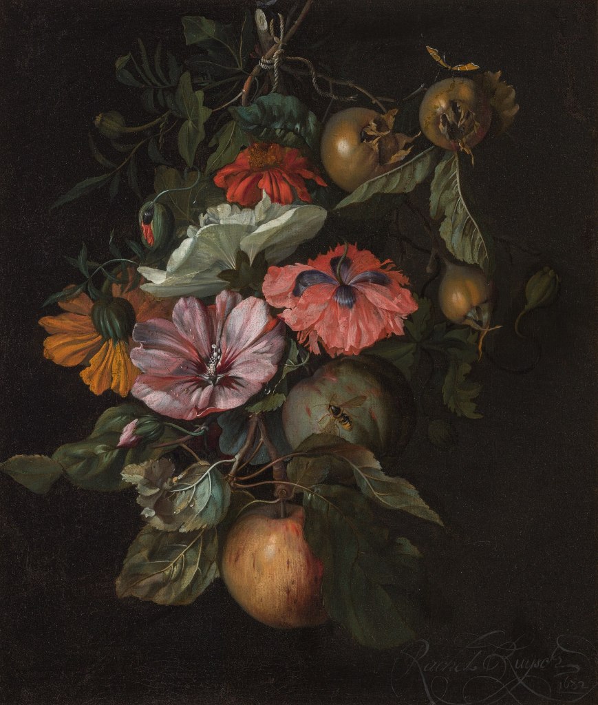 Ruysch’s paintings embody all these things in visual theatre that captured great interest. Through her father Frederick Ruysch, Rachel was able to do botanical studies. He was closely involved with botany and horticulture and with his preserving technique would have helped provide plants and insects for study. Ruysch’s work was life-like with her faithful renditions earning her acclaim. Important developments in still life came from the Dutch and Ruysch’s work influenced followers. The genre continues to this day with varied interpretations.